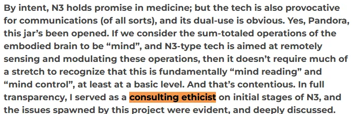 In my presentation, I mention that Giordano was a consulting ethicist on DARPA’s N3 programme. Wallace thinks she knows better, however: “He’s not an ethicist” (15:00). Well, here is Giordano’s LinkedIn post from 2024: