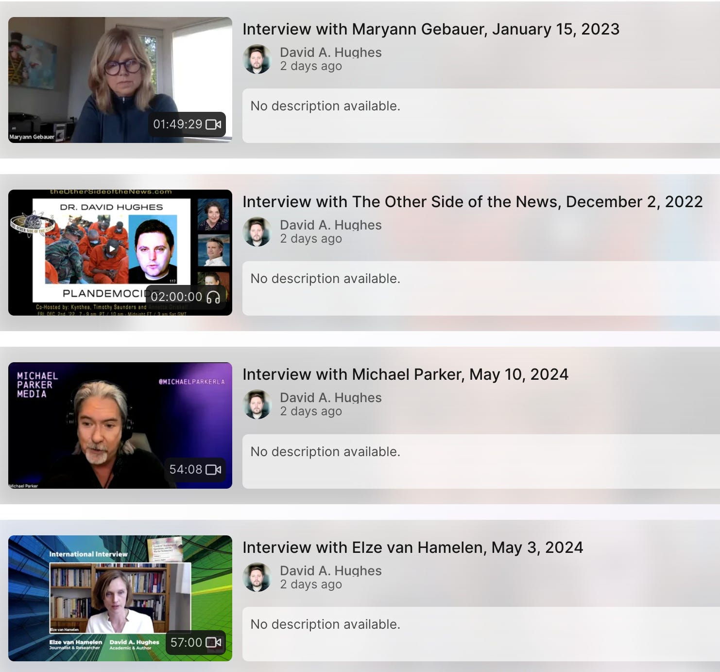 I have created different playlists on Odysee, titled Interviews, Presentations, Covid Shorts, “9/11,” and Manchester. Only the interviews and presentations are my original work. I am using the other three playlists to park videos that I think may be useful.