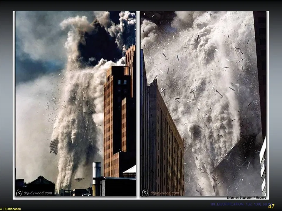 Jones dismisses Wood’s claim that the Twin Towers were “dustified,” yet he himself, in an apparent act of appropriation, claims that the upper 30 floors of the South Towery “turned mostly to powder in mid-air,” a “remarkable, amazing […] phenomenon” (2006, p. 29).