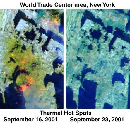 The first EarthData images were taken on September 16, 2001, five days after the WTC complex was destroyed. They were not GPS referenced and had to be superimposed on ICONOS imagery. The result appears crude and in principle producible using software such as Microsoft Paint: