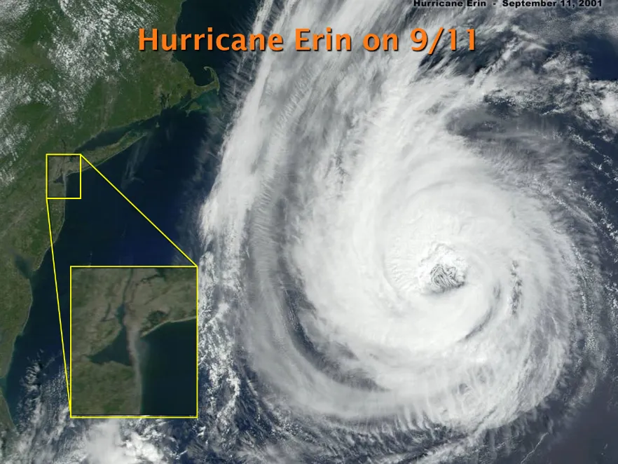Wood suggests that Hurricane Erin, sitting just off the coast of New York at the time of the attacks, could, like a massive Tesla coil, have produced “vast energies and field effects” drawn on during the destruction of the Twin Towers before suddenly making a 90 degree turn and moving away again (2011, Ch. 18).