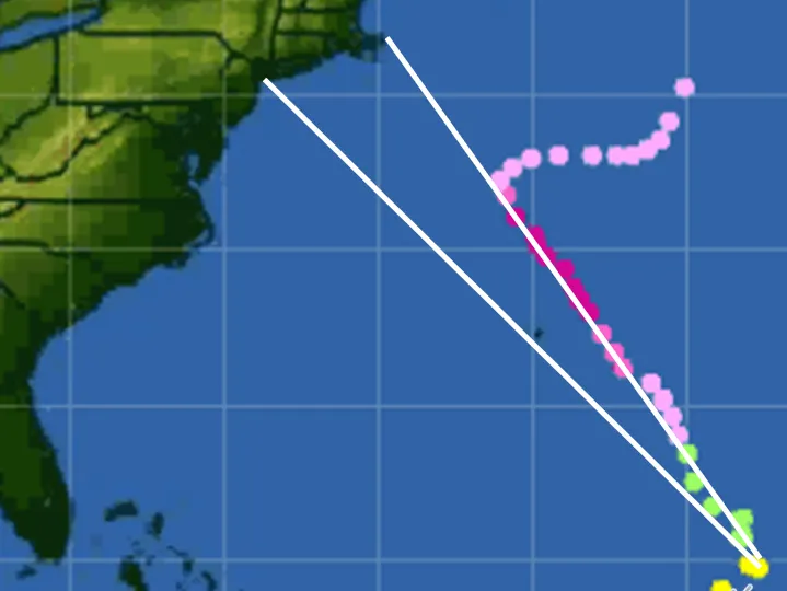 The hurricane dramatically changed course sometime after 8am on September 11, 2001, coinciding with the WTC attacks, having headed in a straight line for the previous four days:
