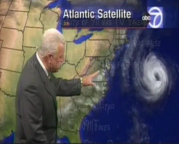 Wood (2011, p. 411) is careful not to draw any firm conclusions regarding Erin, but her suspicions are roused by “the fact of Erin’s having been treated as a carefully kept secret, much like a state secret.” As evidence of this alleged secrecy, she shows weather maps broadcast on ABC 7, NBC 4, FOX 5, and CBS 9 between 8:31am and 8:36am on September 11, 2001 (see the corresponding video footage here); none show any sign of Hurricane Erin (2011, p. 400).