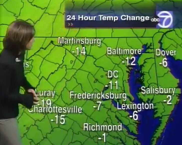 By 5:47am on September 11, 2001, it appears that the cold front had already reached the East Coast. ABC 7, for instance, shows the temperature difference compared to 24 hours earlier: