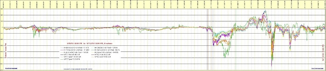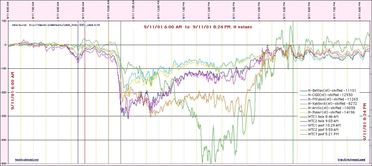 Wood (2011, Ch. 19) claims that there were major changes to the Earth’s magnetic field during the 9/11 attacks, evidenced by data from the Geophysical Institute Magnetometer Array of the University of Alaska :
