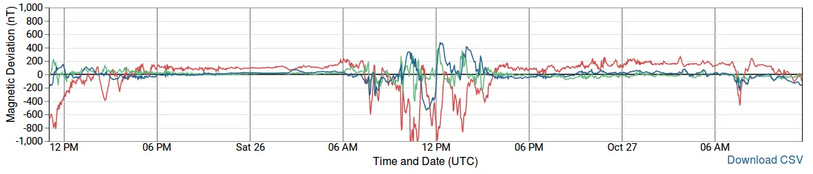 To be sure, judging by this evidence, there was considerably more magnetometer activity on 9/11 than on the preceding two days (2011, p. 414). However, the Geophysical Institute Magnetometer Array of the University of Alaska appears to show a big increase in activity in the hours leading up to midday quite often. For example, here is a reading I randomly captured on October 26, 2019: