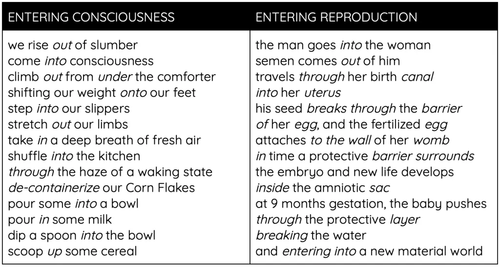 As Johnson points out, our understanding of our own bodies as containers pales in comparison to all the other daily experiences we tacitly know and engage with in terms of the container. What follows are numerous implicitly understood in-out orientations that occur in routine states of arousal to conscious awareness and to reproduction — that incredible natural process that must come under the control of the transnational Giants[18] invested in the Revolution.