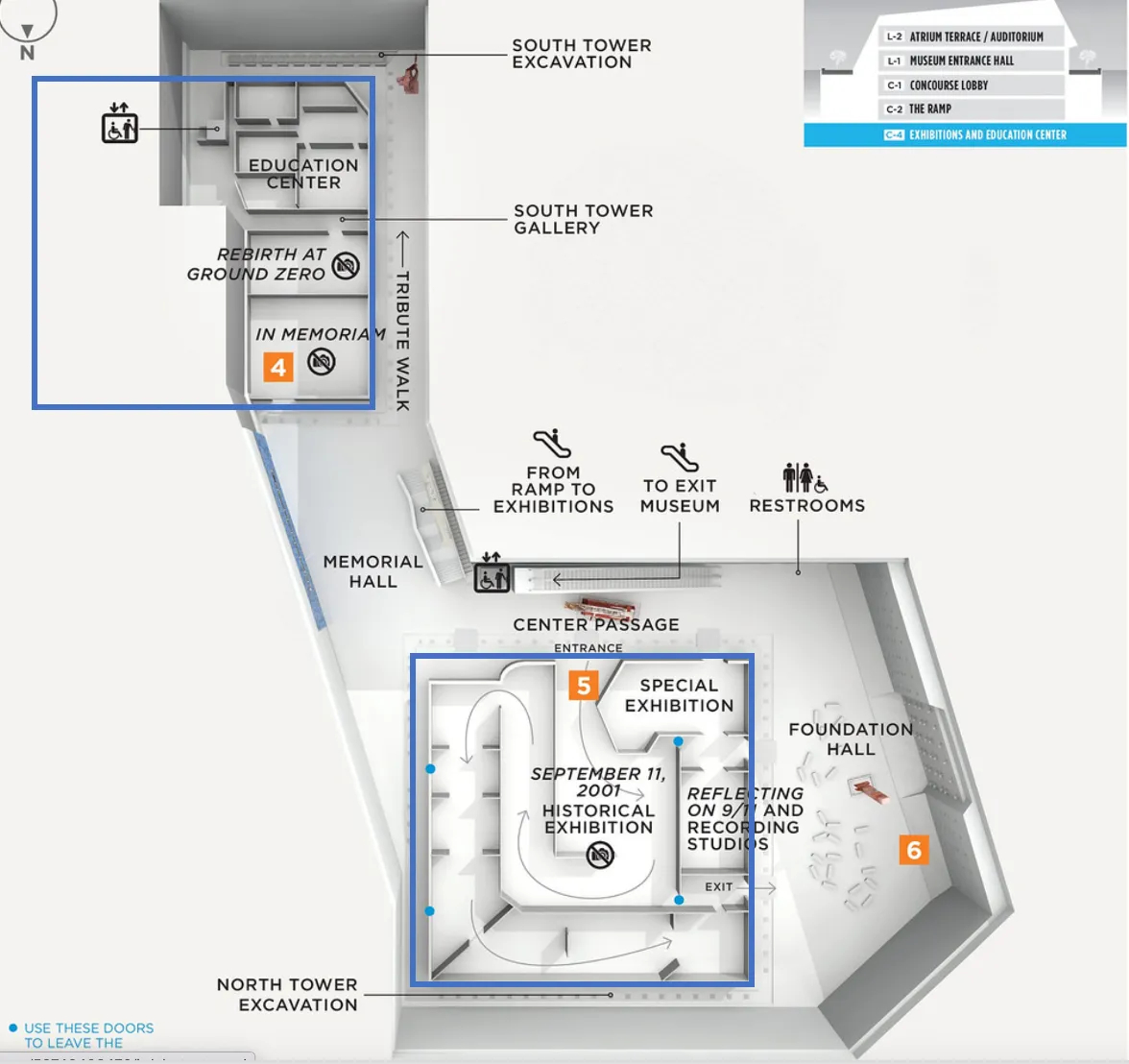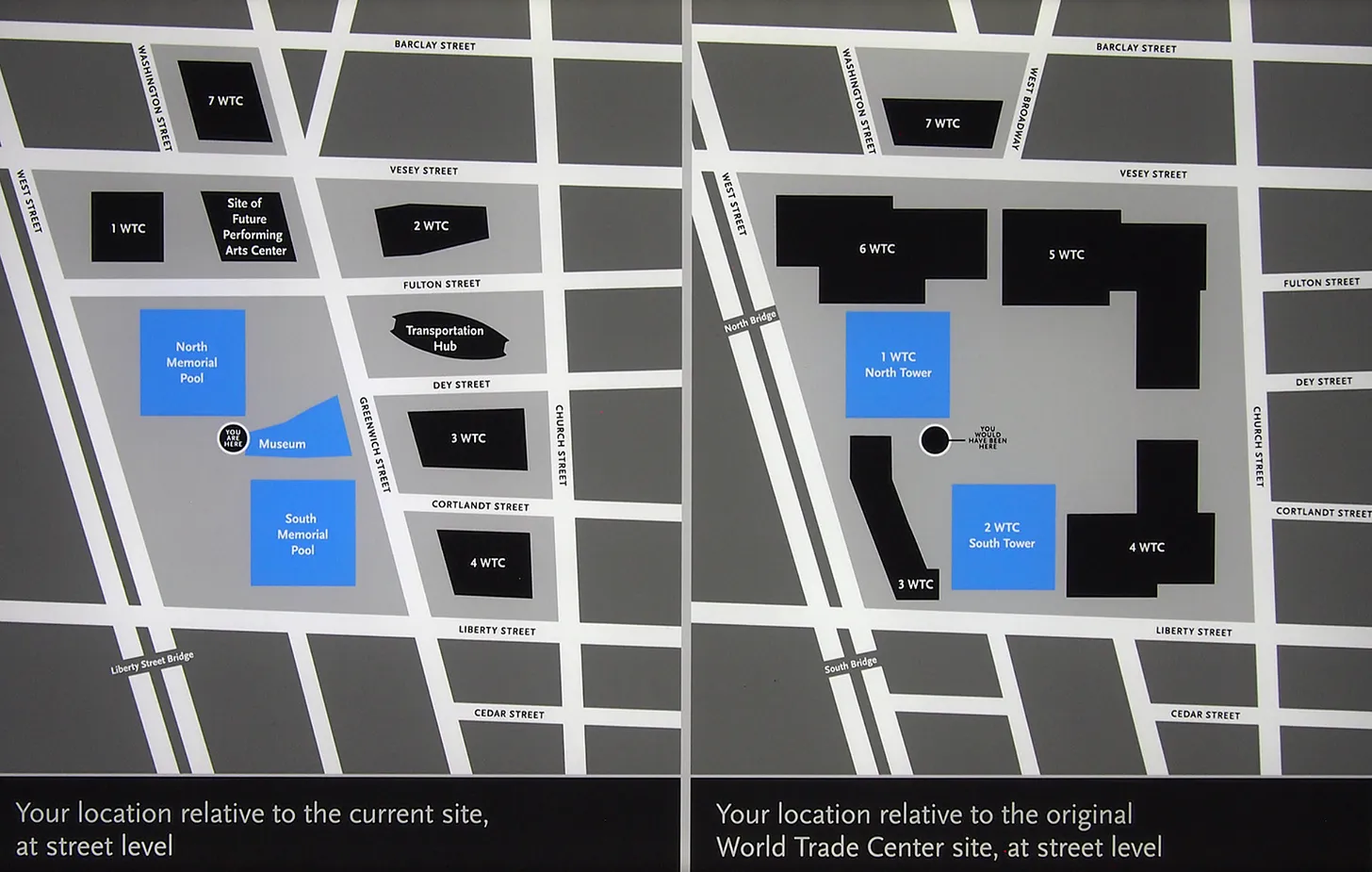 Furthermore, when I visited the 9/11 Museum, which is mostly underground, I discovered that visitors walk around the entire area beneath the North Tower pool, as well as part of the area beneath the South Tower pool.
