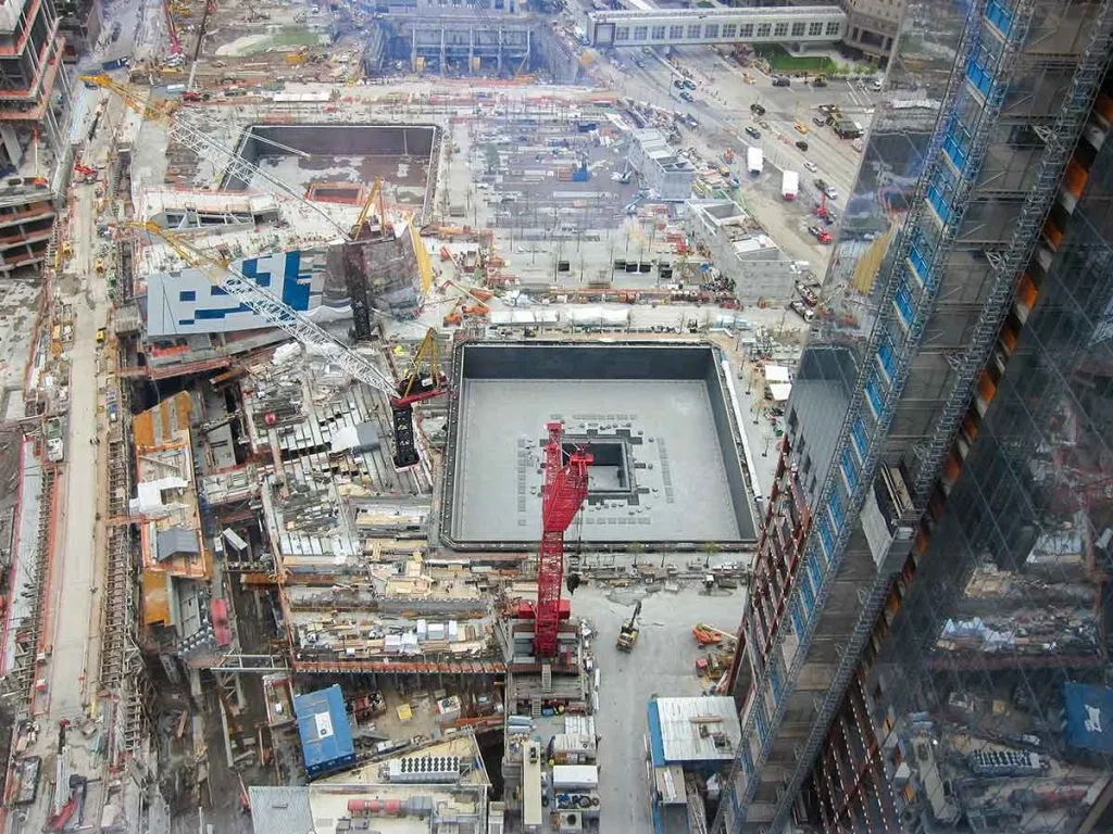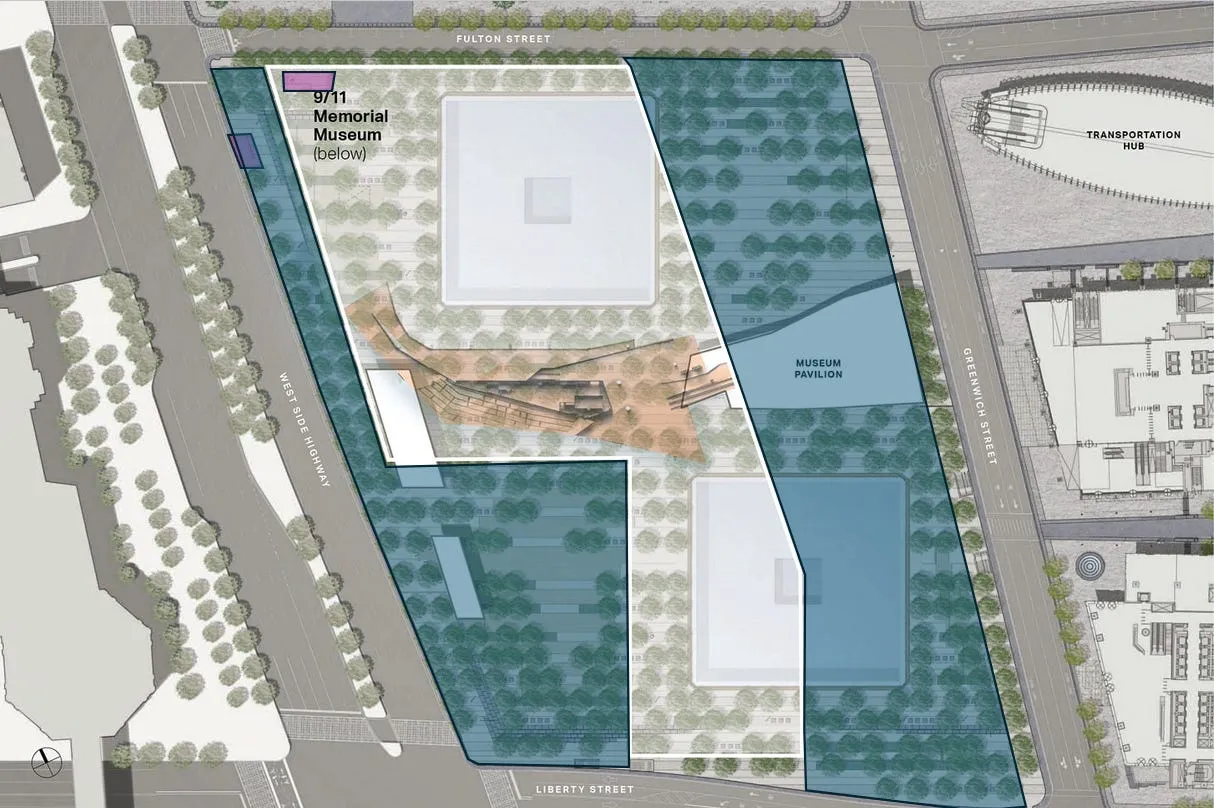 Beneath the pool, the footprints of the outer box columns of the former WTC1 are visible.
