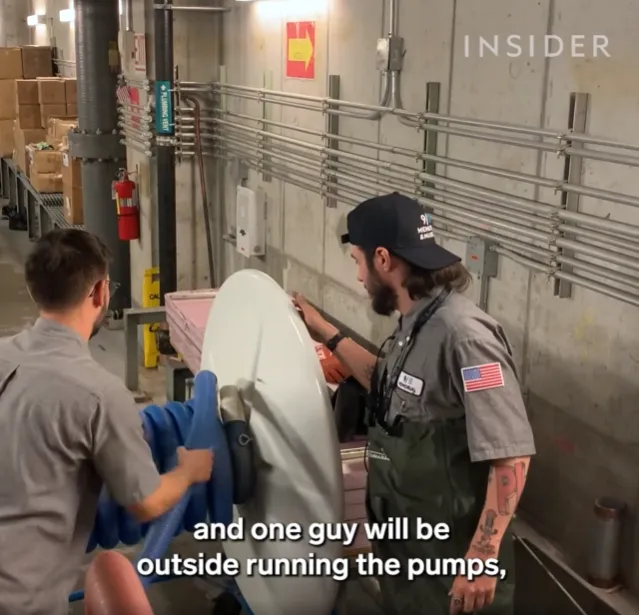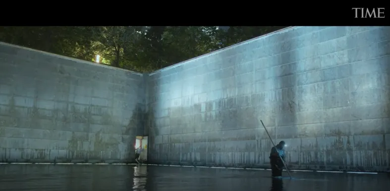 It is possible for site officials to gain access to the bottom of the pools, however. This is necessary for cleaning and maintenance work, which takes place every weeknight between 00:00 and 08:00. For example, here is James Maroon at work: