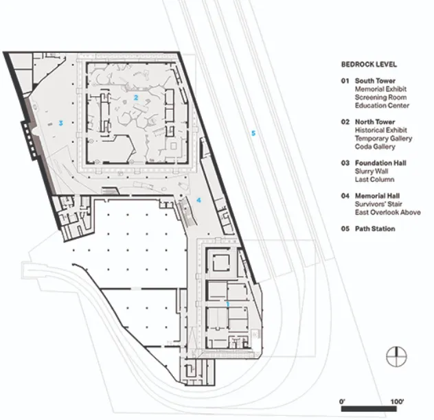 The 9/11 Museum, cut off by the PATH lines, therefore appears to reach down to bedrock, or very close to it.
