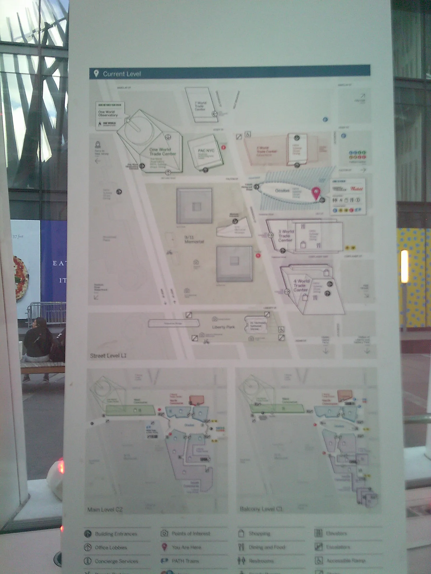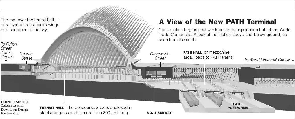 A sign at the entrance to Oculus in 2025 reveals little substantial difference from the 2004 plan, apart from the location of the Saint Nicholas Church, the rebuilding of the bridge across West Street, and the fact that the new WTC2 and WTC5 have still not been built.