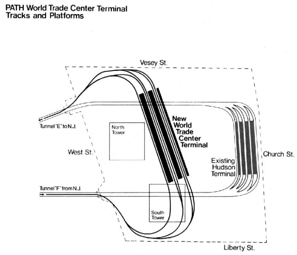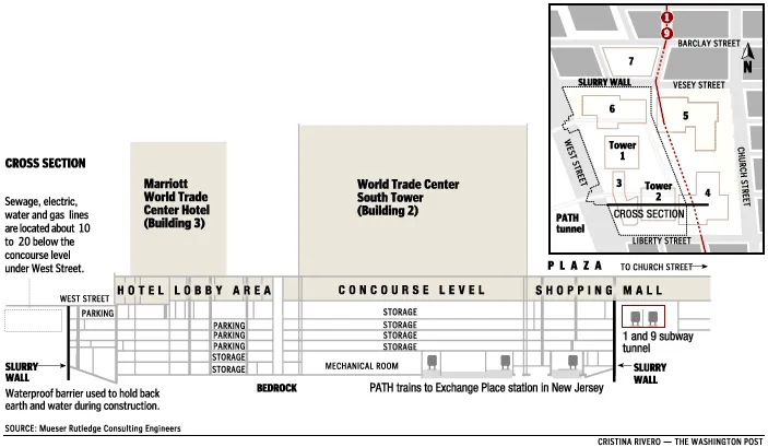 A similar cross-section published in the Washington Post shows the PATH trains running underneath the South Tower, at the very bottom.