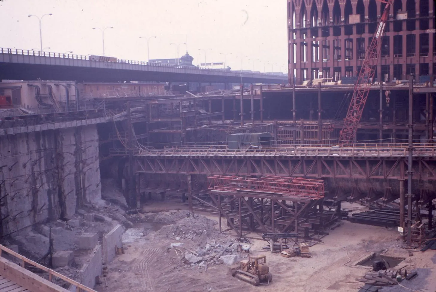 Even though the original PATH train route was altered, its entry/exit level through the slurry wall could not be, and the following photograph from 1969 clearly shows that it was close to bedrock: