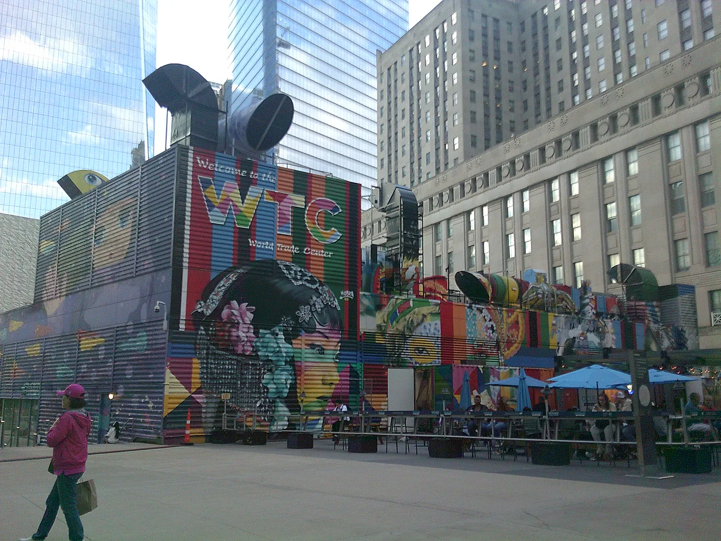 Meanwhile, the far end of the block (toward Church Street) is heavily graffitied (the so-called “mural project”) and contains a beer garden — entirely out of keeping with the solemnity one would expect at the spot where WTC5 used to stand.