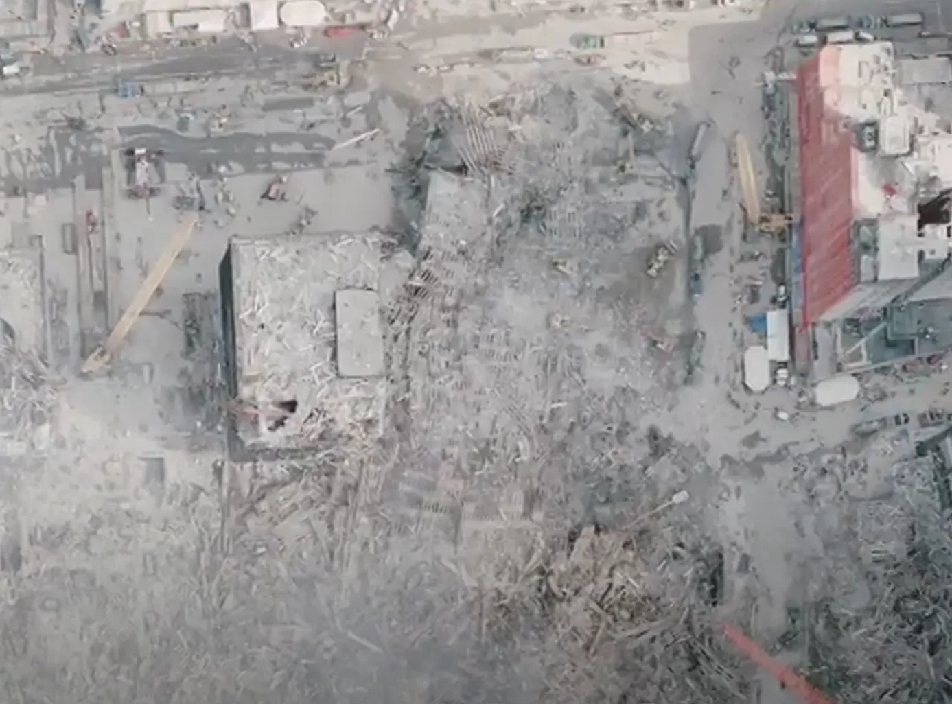 We saw with WTC4 that the outer wall of WTC2 effectively flattened most of the building. Similar could be true with respect to WT6 and WTC1, respectively. Indeed, if we look to the opposite side of the main hole in WTC6, we can see part of the outer wall of WTC1 visible almost like a waterfall as I have highlighted it.