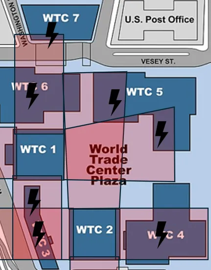 If we imagine the Twin Towers peeling apart and crudely plot (using red rectangles) where the main damage to other buildings would have been, we find that it corresponds fairly closely to the actual damage caused (marked by lightning symbols on the diagram below).