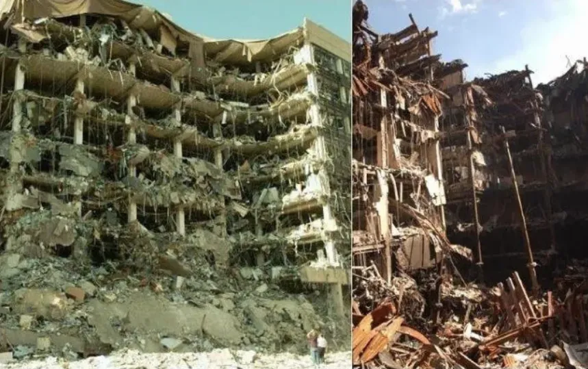 Critics have observed the similarities between the destruction of the Alfred P. Murrah Building in the Oklahoma City bombing of 1995 and the destruction of WTC6 in 2001: