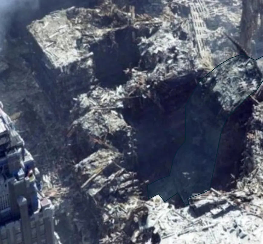 Note the section of WTC2’s outer wall in the foreground that I have ringed. Incredibly, this massive section (for scale, see the people in the bottom right of the image below) landed upside down on the far side of WTC4, having possibly broken off from a section of wall that appears to be lying on top of WTC4.