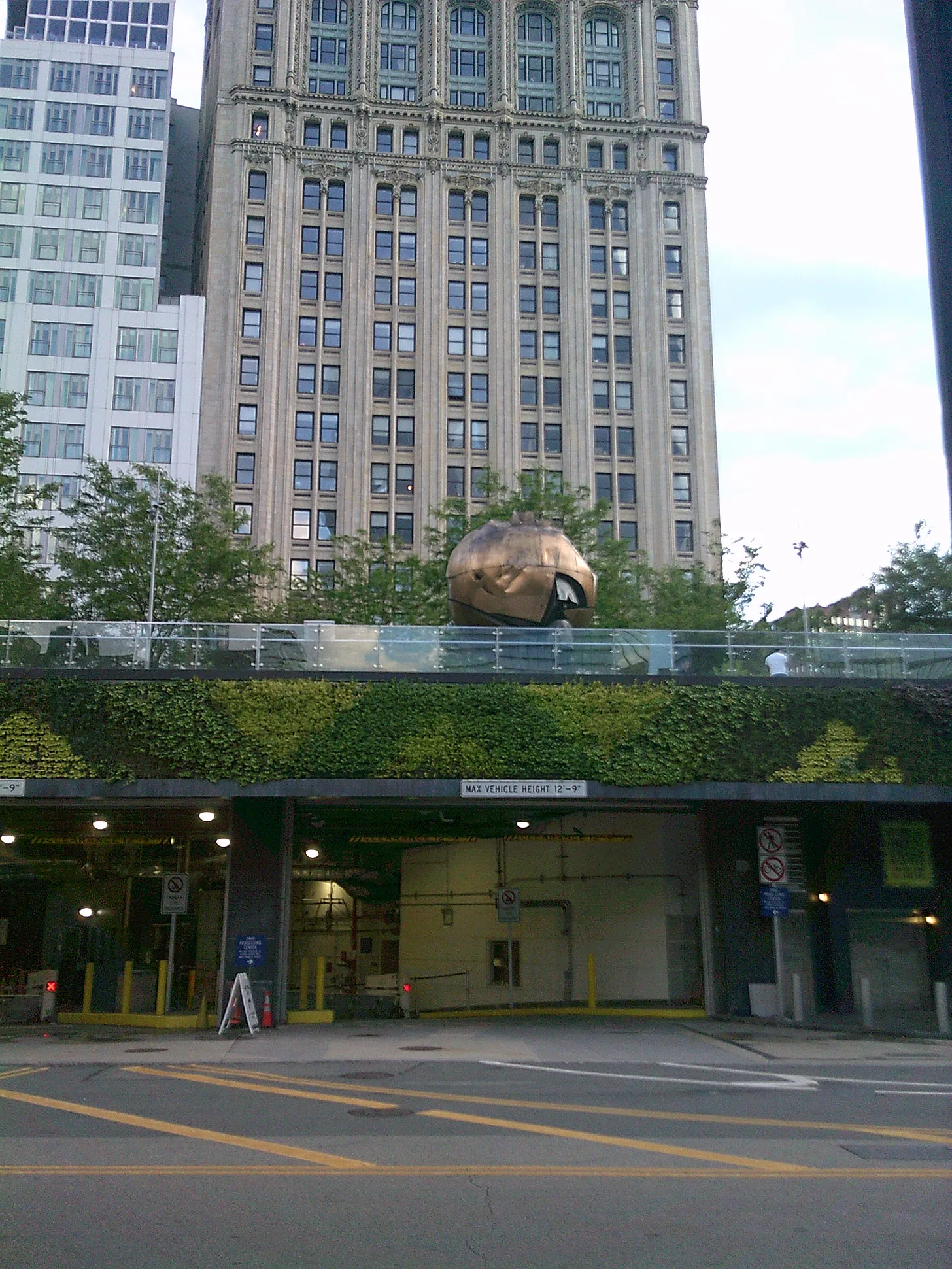 Below we see “The Sphere” in relation to the Twin Towers, cast in shadow.