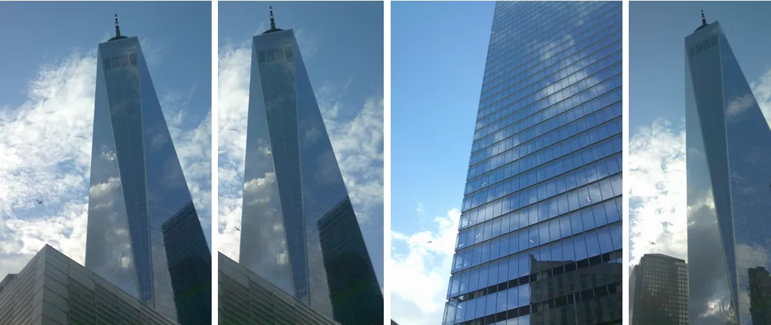 Admittedly, the planes had gained altitude and were to the west of the WTC site by the time they passed, but I could not help noticing how tiny they were in relation to One World Trade Center from ground level, as shown below when photographed on three separate occasions.
