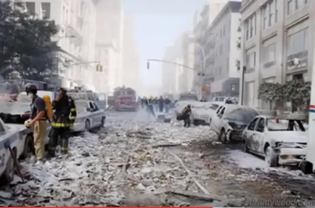 How could two collapsing buildings do this to nearby vehicles, without burning the paper or the people caught up in the dust clouds?