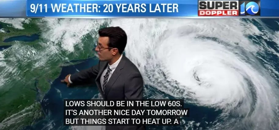 Below is a weather image from 2021, which illustrates that it is not exceptional for a hurricane to be stationed not far from New York on September 11. Again, the impact is worse on Cape Cod than Lower Manhattan:
