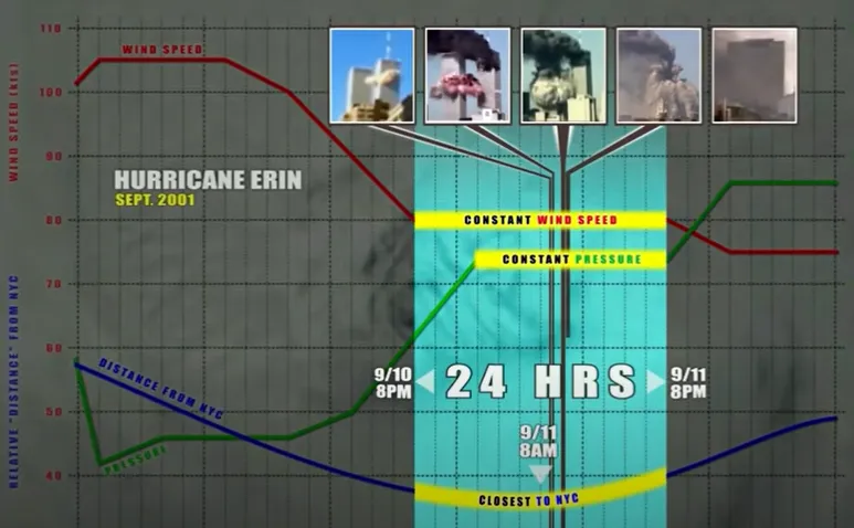 Similarly with Hurricane Erin: there is evidence of a hurricane just off Cape Cod at the exact time the Twin Towers were being destroyed. As Wood (2011, pp. 397-398) observes, “For the 24 hours surrounding the events of 9/11, Hurricane Erin maintained the same wind speed, the same pressure, and approximately the same distance from New York City."
