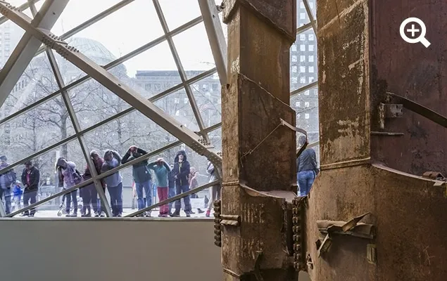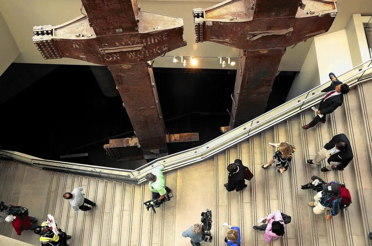 Having passed security checks, visitors begin their descent into the museum by passing two giant tridents salvaged from the base of the of the Twin Towers.