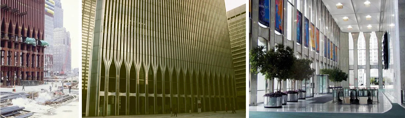 Below are the tridents as they originally stood — during construction, after construction, and from inside the lobby.