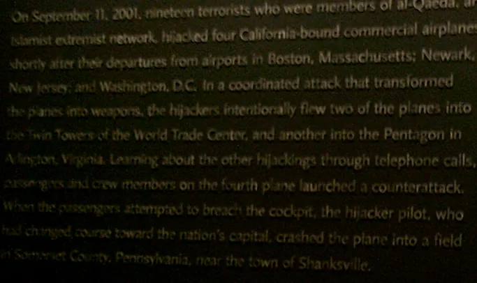 The idea of descending below ground to gain enlightenment about what happened on September 11, 2001, is enormously problematic. There is a sense of going down into the underworld, or to a dark place where terrible things happened. The low lighting in the museum does not help with that. There is no attempt to illuminate what really took place, just a subterranean journey that risks reactivating unconscious trauma.