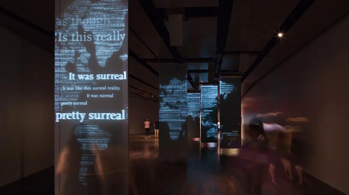 an audio tapestry from the testimonies of 417 people describing where they were when they heard about the attacks. From the voices of downtown workers to TV news reports and phone calls from around the world, the experience reminds visitors that the shocks of this day reverberated around the world, with an estimated one billion people experiencing the attacks in some way within the first 24 hours.