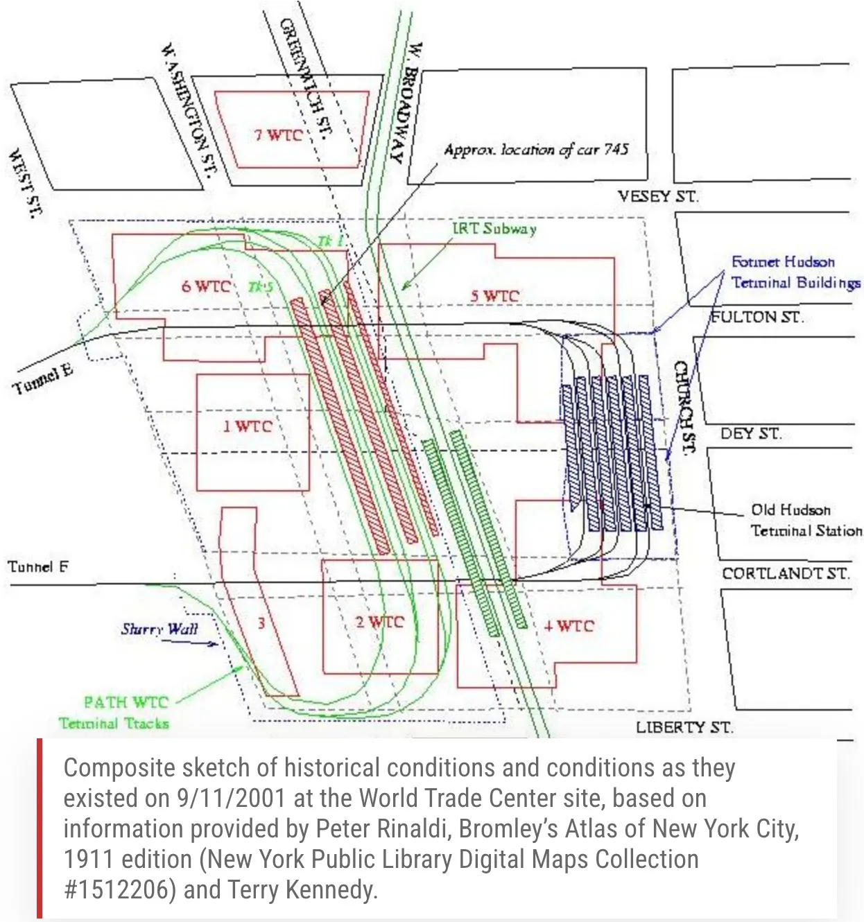 For example, consider the proximity of the PATH (Port Authority Trans-Hudson) train platforms (marked in red below) to the Twin Towers: