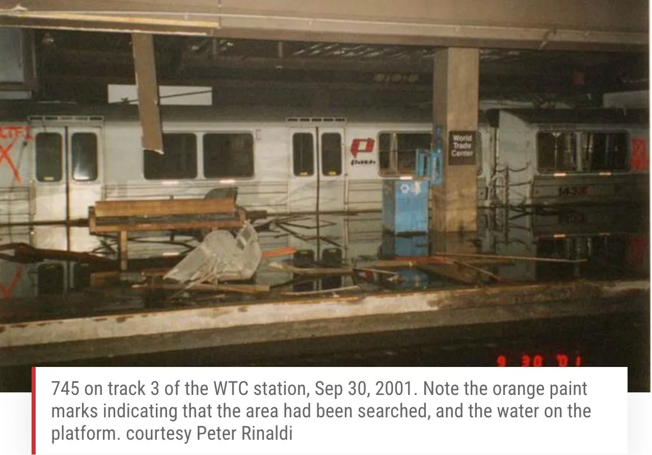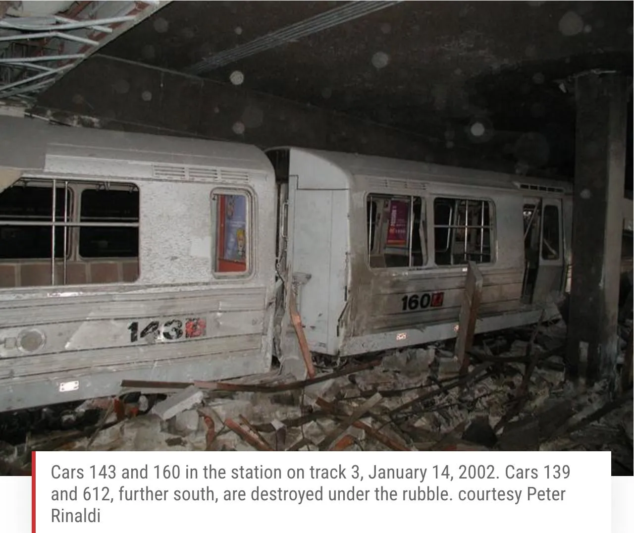 Cars 139 and 612, which were furthest down the platform, were, according to Heritage Rail, “destroyed under the rubble,” although no images are provided. Peter Rinaldi, retired Senior Engineer for the Port Authority, claimed that no one on board the train perished, which suggests that passengers were evacuated before that damage occurred.