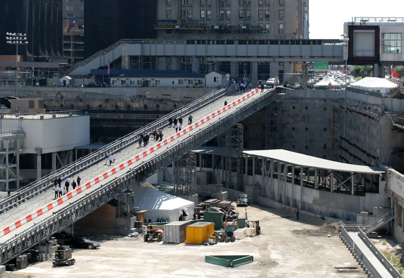 The dramatic counter-example is a section of the slurry wall (the concrete retaining wall built to hold back the Hudson River when the WTC site was first excavated in the 1960s) that has been left exposed to the west of the North Tower memorial pool.