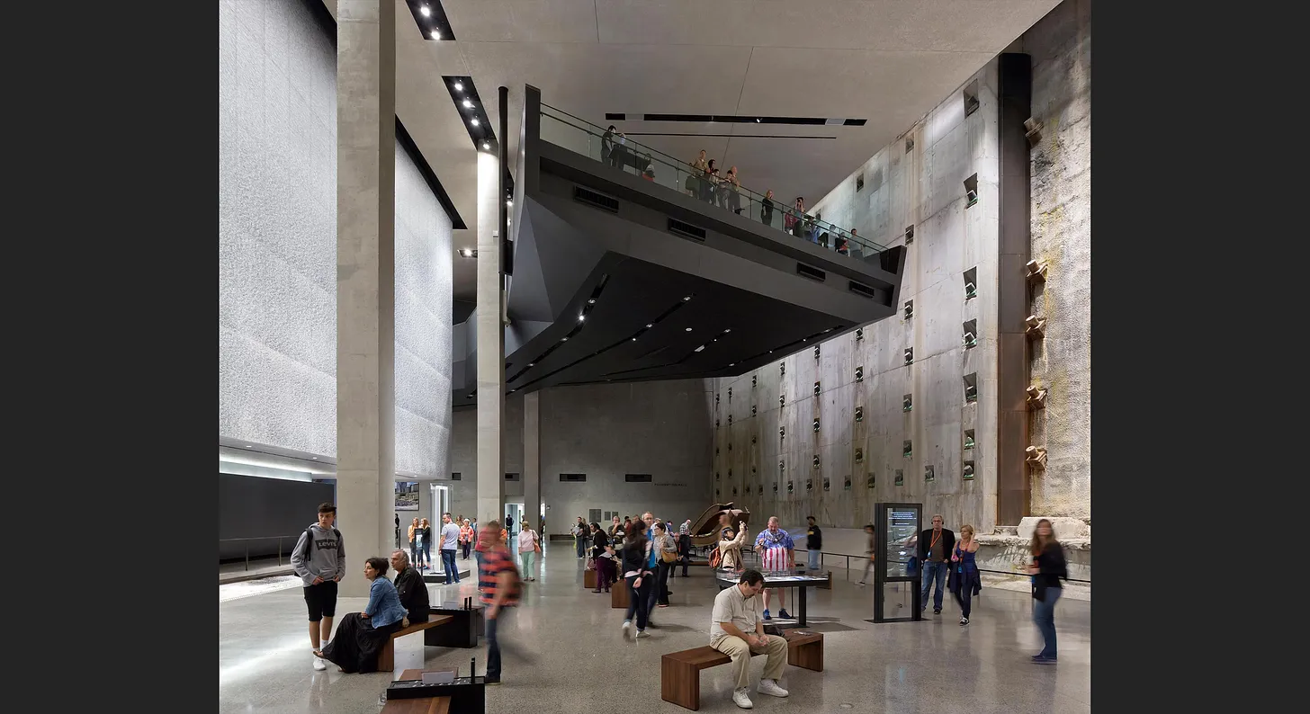 Once underground, visitors continue their descent to the main exhibition area of the museum via a ramp that officially “evokes a history of construction ramps at the World Trade Center site: one to build the original complex in the 1960s and another installed during the post-9/11 recovery period.”