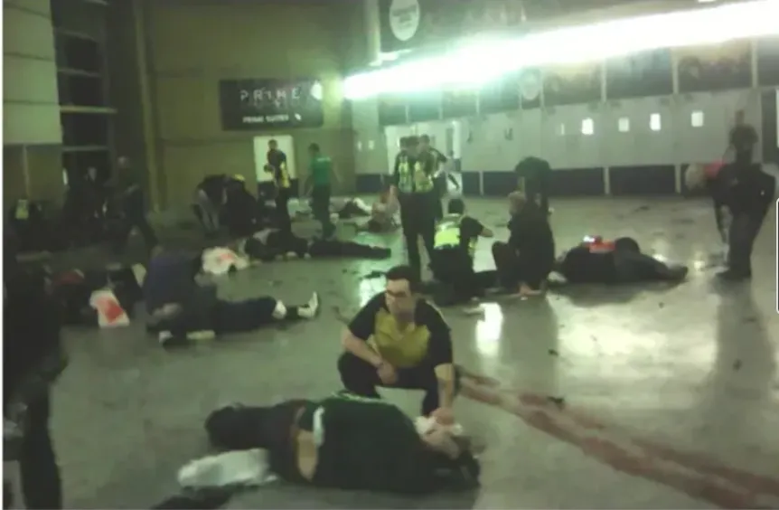 We had come out of the box and gone into the main auditorium. But I brushed shoulders with him, the terrorist, and the trajectory of that took me thankfully away from him. He was going in as we were coming out. We got about half-way down the auditorium, going towards the exit and that’s when the bomb went off.