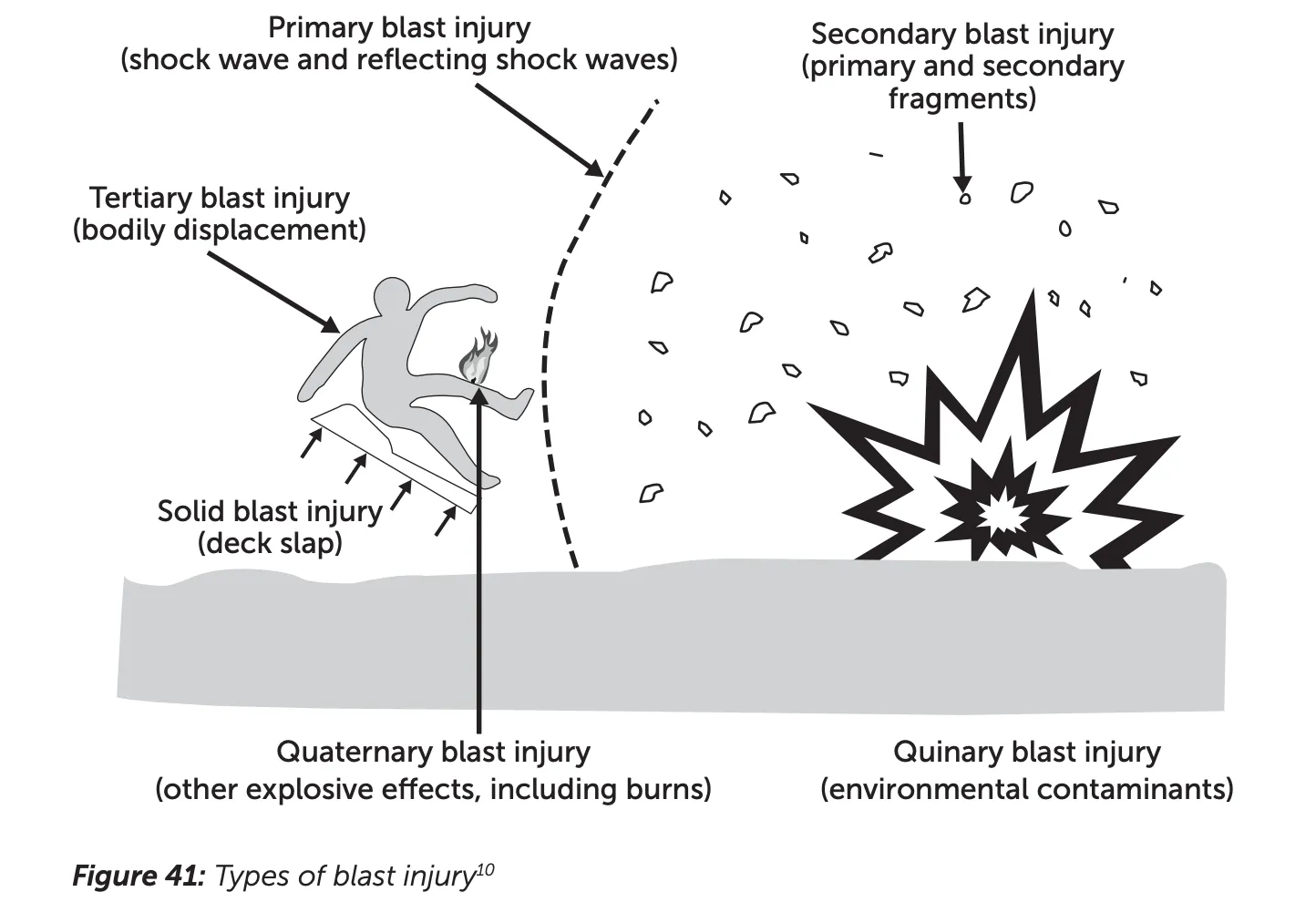 Blast injuries fall into five categories, the first three of which are relevant in the case of a TATP shrapnel bomb.