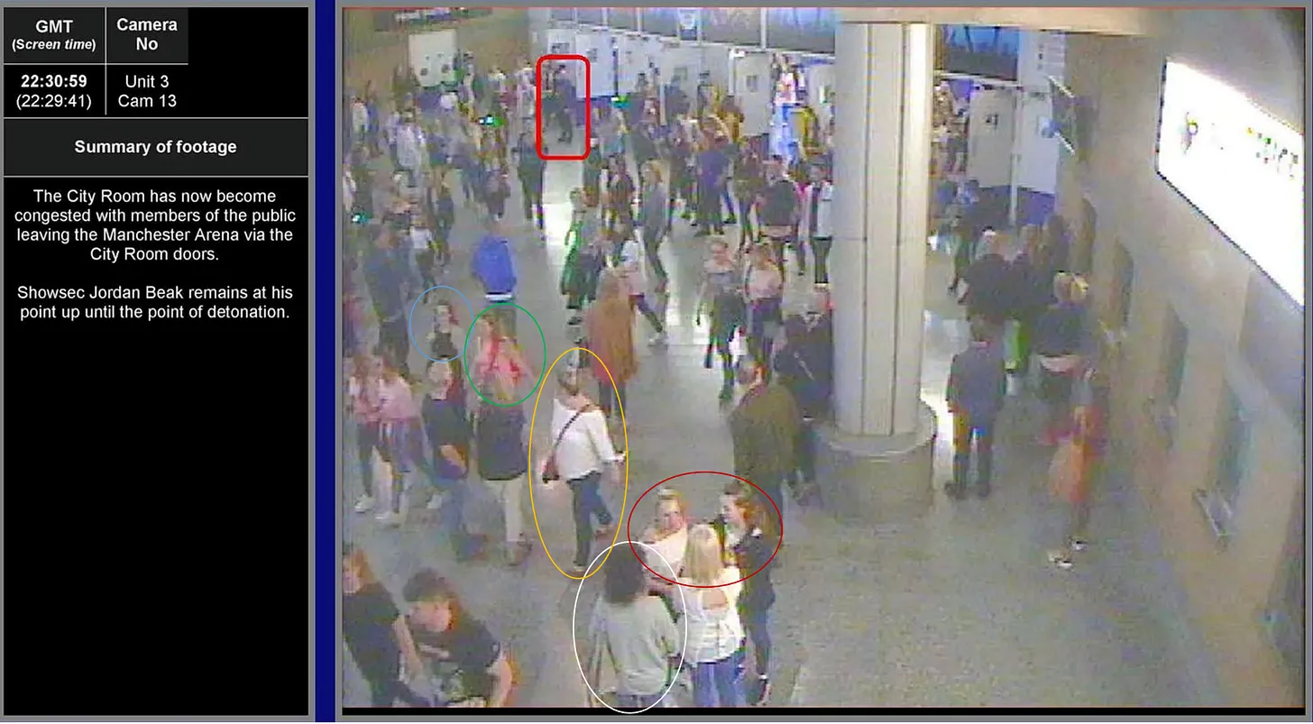 Officially, the “appalling injuries” that Saunders claims to have seen on body-worn camera footage were caused by Salman Abedi detonating a TATP shrapnel bomb in the middle of the City Room at 22:31:00 on May 22, 2017.