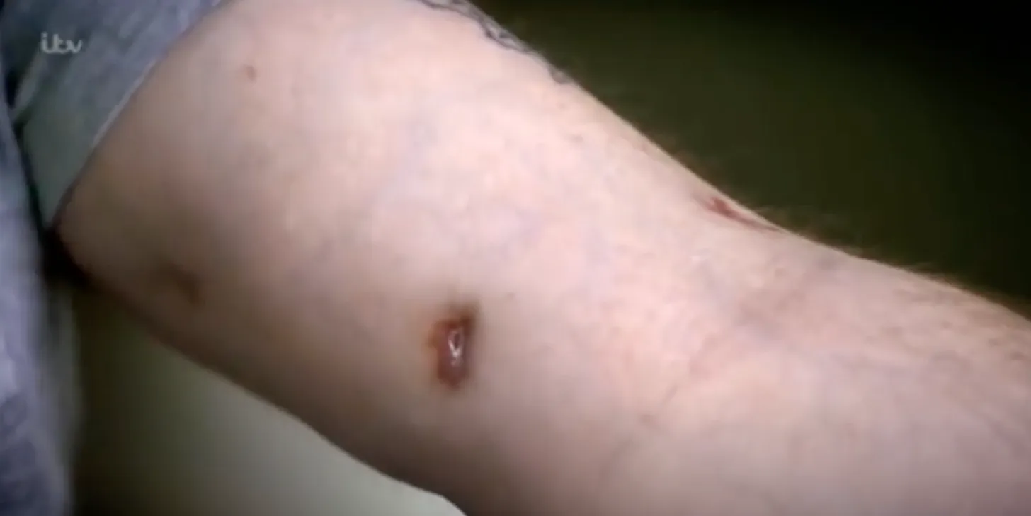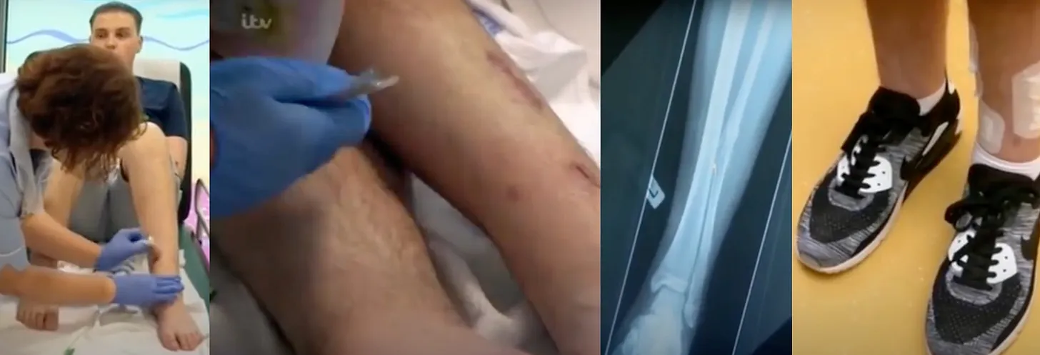 Although the programme draws the viewer’s attention to Lawler’s left leg, a more severe looking injury appears on the back of his right leg:
