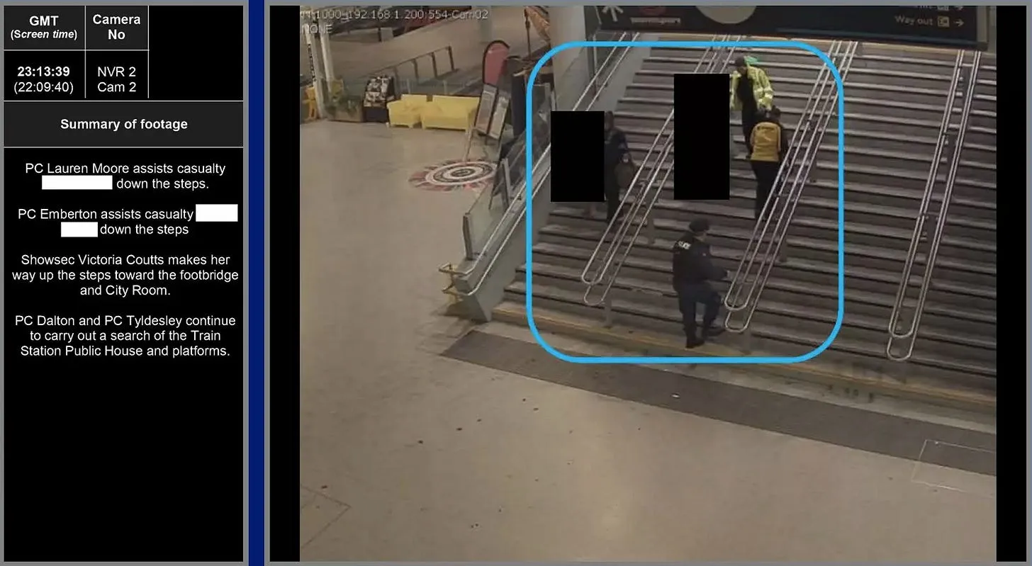 More specifically, PC Thomas Campbell and PSCO Jon Morrey each applied a bandage to John Atkinson. PC Stephen Corke, PC Mark Emberton, PC Jane Bridgewater, PC Bullough, PC Edwards and PC Michelle Johnson helped with John Atkinson’s evacuation. Sergeant Wilcock “checked on” Wendy Fawell. Temporary Detective Constable Mark Haviland helped to find a makeshift stretcher for Saffie-Rose Roussos, and PC Simon Trow helped carry Saffie-Rose Roussos from the City Room to Trinity Way. Sergeant John Whitaker and PC Corke checked Marcin Klis for a pulse.