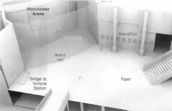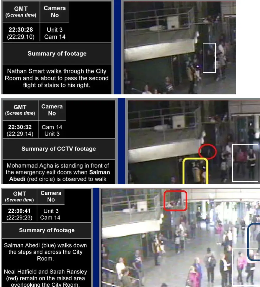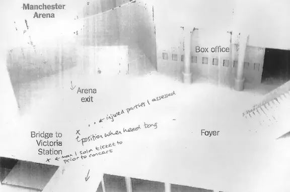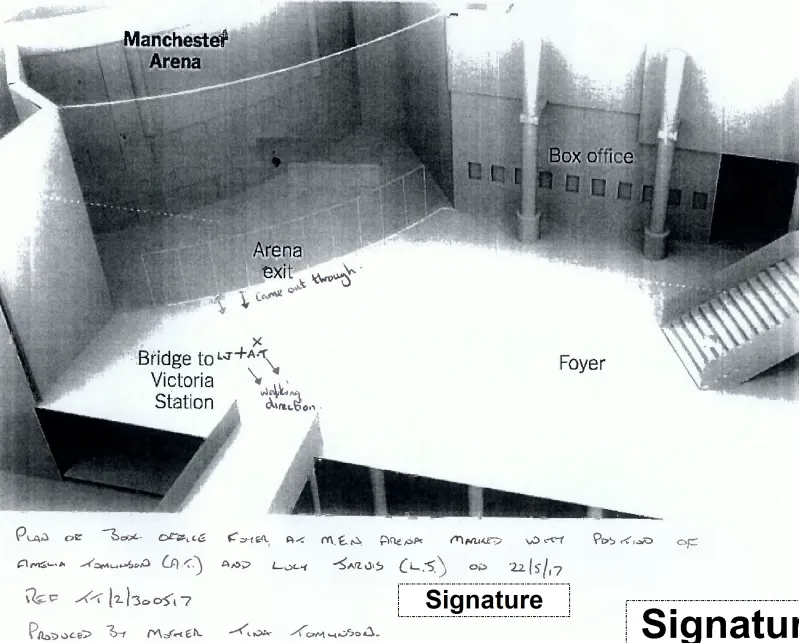 - Yvonne Clayton (partner of Andrew Scullion): “We got to the foyer having come through the doors linking the arena and Manchester Victoria and stood near to the steps at the back that were next to the doors leading to the station” (p. 53). Clayton also gave evidence corroborating the claim that Abedi deposited his rucksack at Point P: ”Having thought about the explosion since, I think it came from the far left near to where the T−shirt stand was” (p. 55).