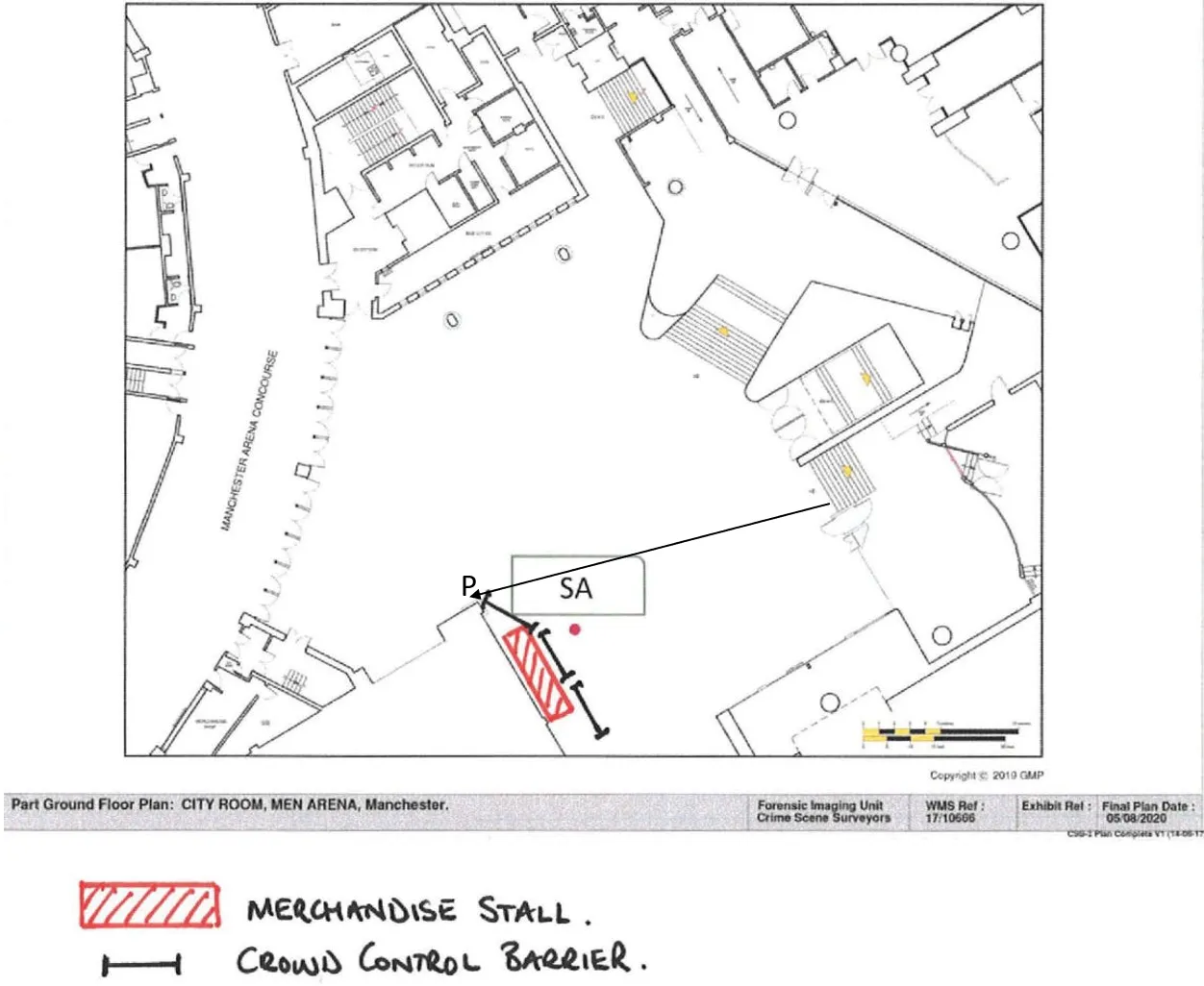 Suzanne Atkins placed herself and her mother next to the merchandise stall as Salman Abedi (SA) allegedly passed them (p. 33), corroborating Davis’s contention that Abedi was headed towards “Point P” and not the official detonation site (see Part 2):