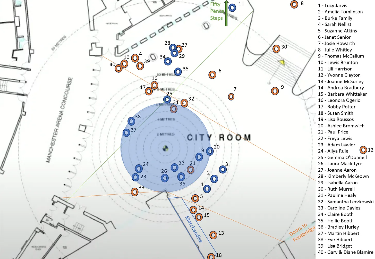 At one level, the spread of the “survivors” makes sense, given the dominant exit path between the orange lines. Those making their way out are marked in blue; those waiting appear in orange. Those in blue above the green line are known to have been making their way towards the Fifty Pence Steps.
