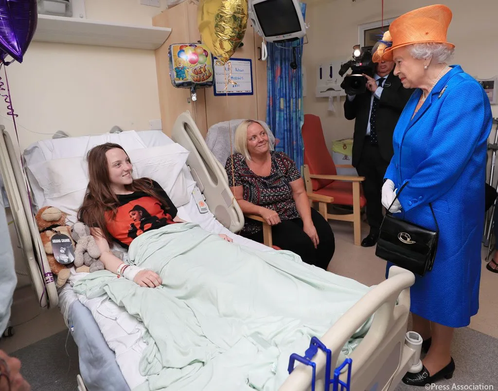 Note the staged appearance of the scene: two soft toys shoved next to Millie (one with an Ariana Grande tag on), matching balloons probably bought from the same shop, no sign of cards or flowers, no medical records at the end of the bed, and an Ariana Grande T-shirt rather than a hospital gown. For some reason, her mother is not expected to stand in the presence of the Queen. The whole scene looks inauthentic and created for the cameras.