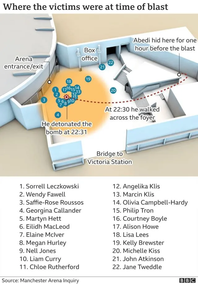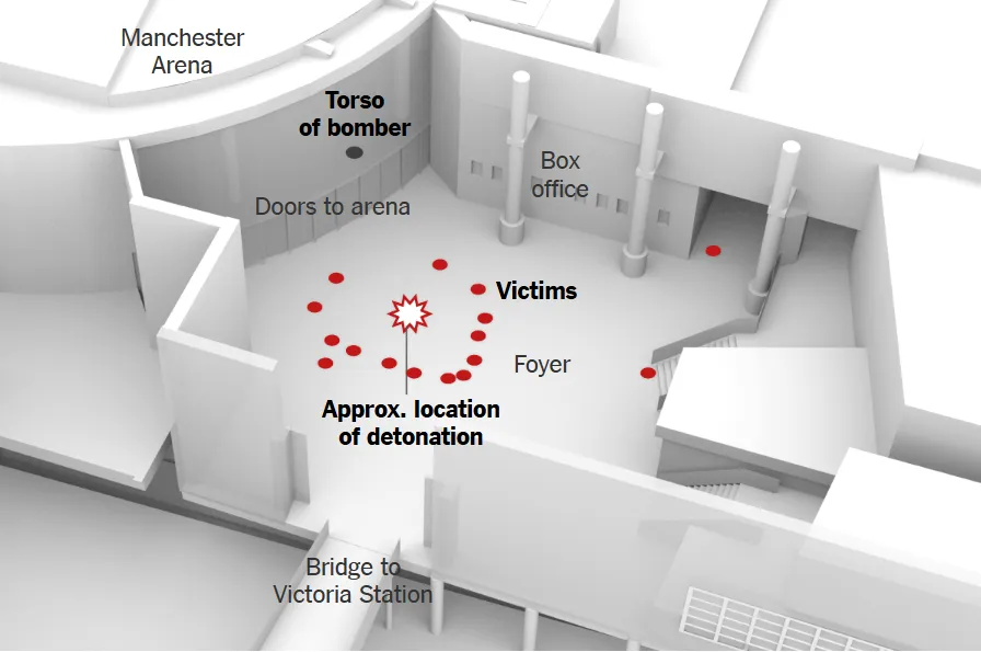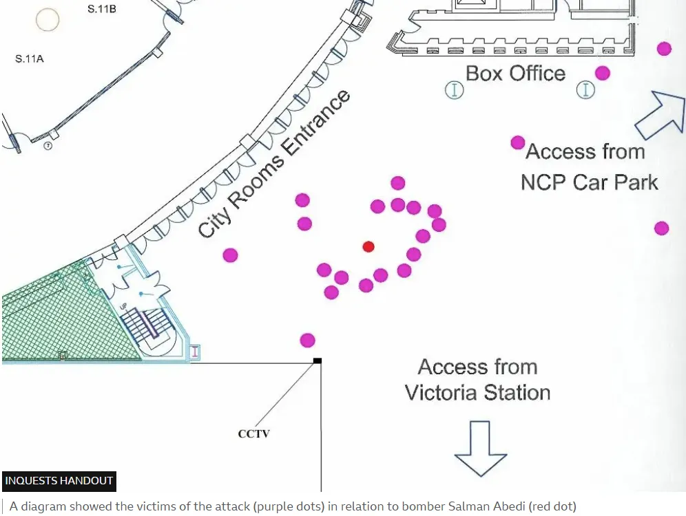 - during the Hashem Abedi trial on May 4, 2020, “Jurors were shown an illustration of where the 22 victims of the bombing fell when the IED was detonated” (according to the Telegraph); and