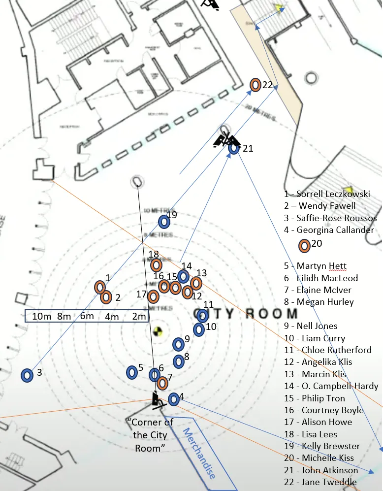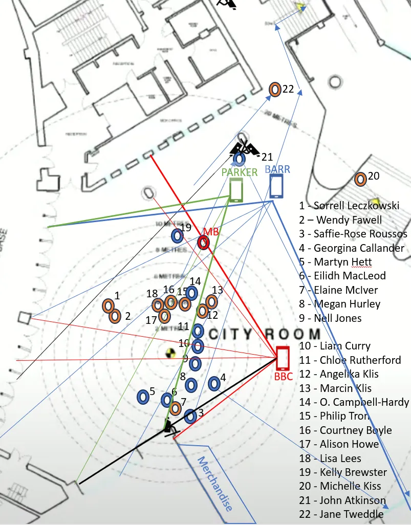 Conversely, with the exception of Brewster [19], who was walking towards the exit in the top right of the diagram, and Campbell-Hardy [14] and Atkinson [21] (who each may also have been headed in that direction), the young people egressing from the concert seem to be heading for the doors to the footbridge and train station.