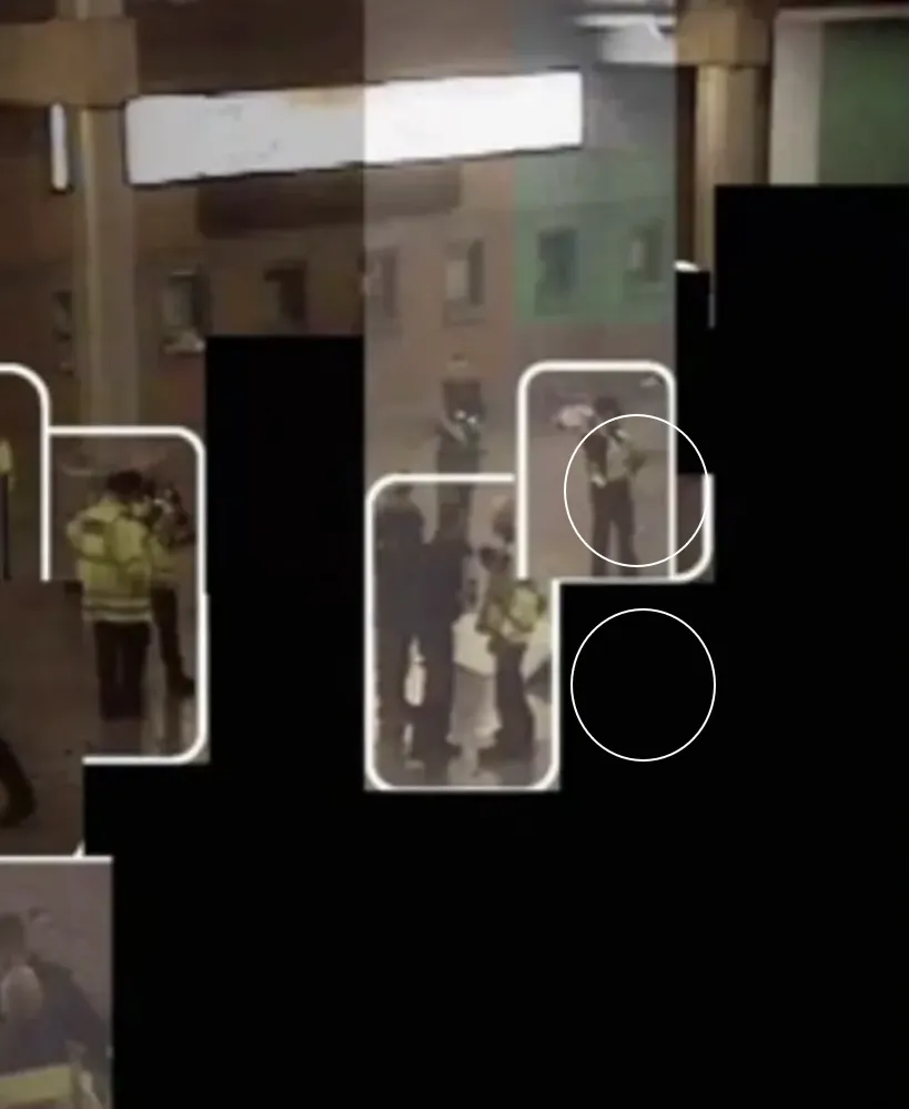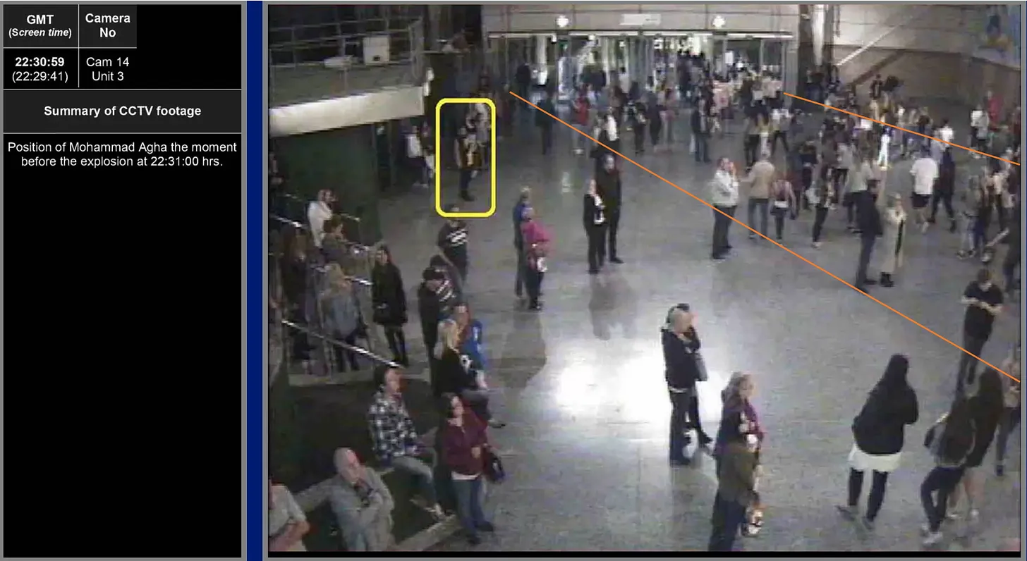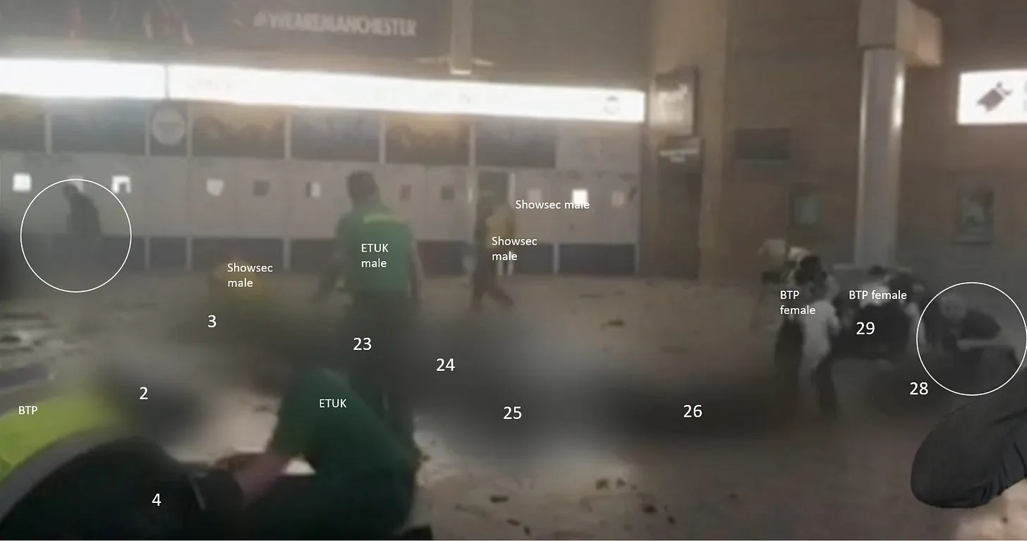 We know that all three pieces of evidence were captured before Inspector Michael Smith entered the City Room at 22:47:51, and before NWAS paramedic Patrick Ennis entered at 22:53:27, because there is no sign of GMP officers or NWAS staff in any of them. This means, in each case, that we are looking at within 16 minutes or so of detonation.