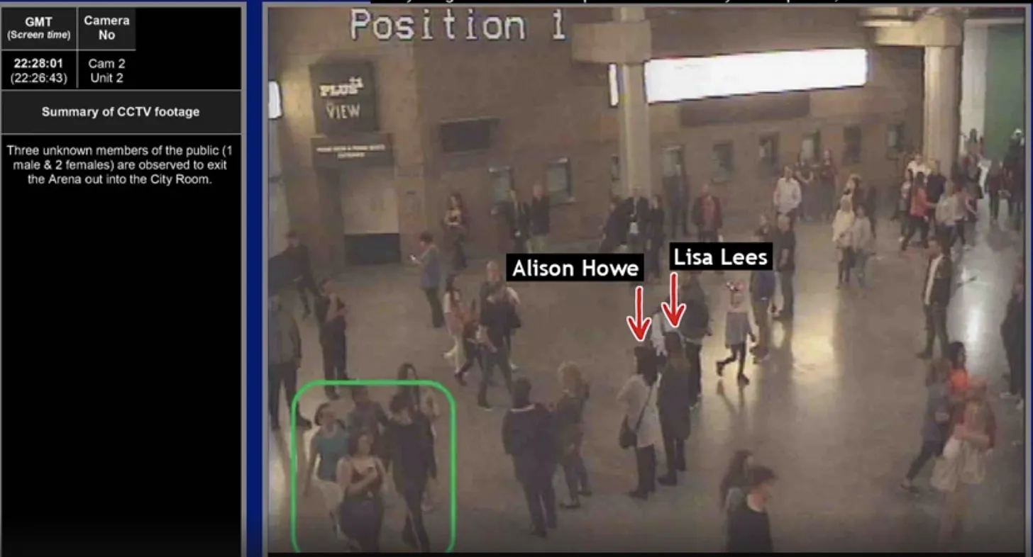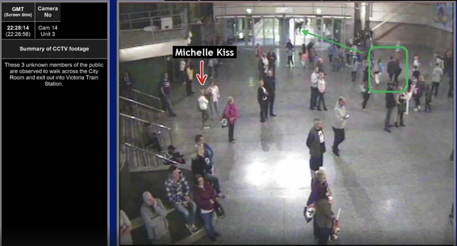At the conclusion of the concert, Saffie−Rose, her mother and her sister are seen entering the City Room from the concourse area at 22.30.45. They are seen to walk across the City Room in the direction of the exit doors which lead towards Victoria Station.
