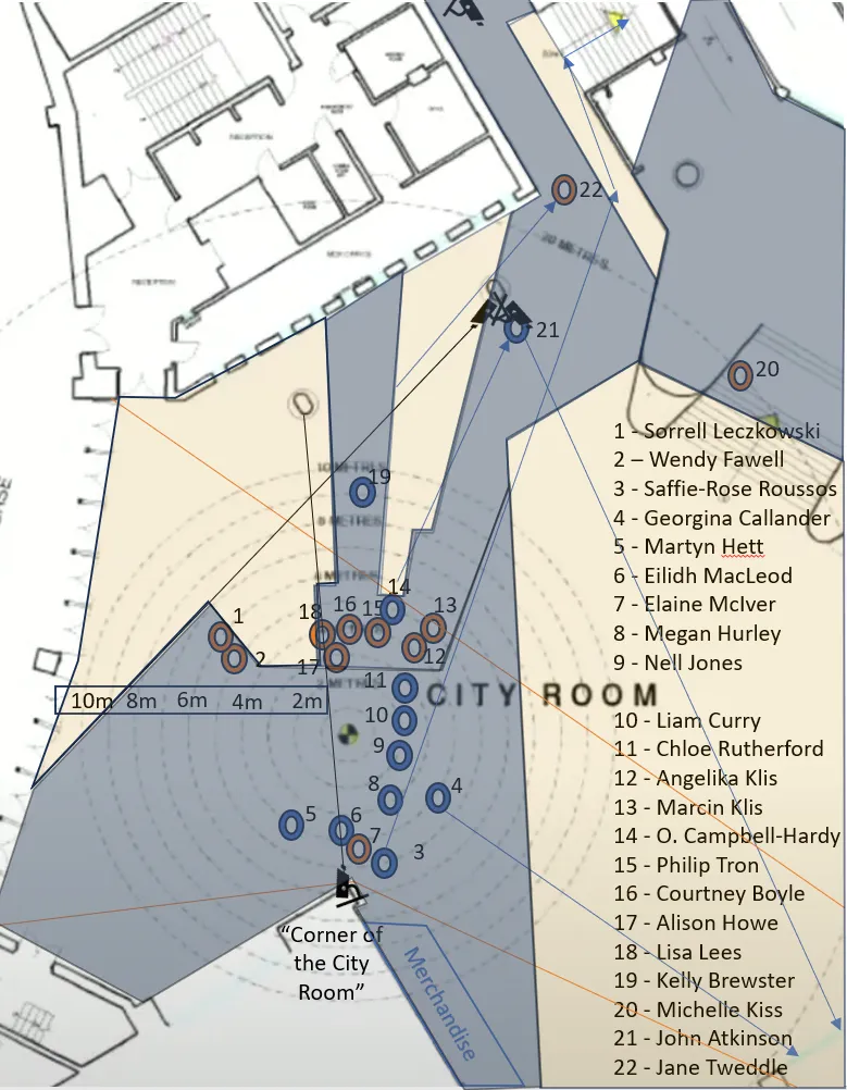 Here, those egressing from the concert are marked in blue and those waiting in orange. The space between the orange lines marks the most direct path from the Arena concourse doors to the exit doors to the footbridge and train station. The blue arrows show where Atkinson [21] and Tweddle [22] managed to move to before collapsing, and where Atkinson [21], Roussos [3] and Callander [4] were subsequently evacuated. “Corner of the City Room” is a phrase used in the summaries of evidence in the transcripts; Callander [4] is said to have been headed in the direction both of that corner and the merchandise stall.